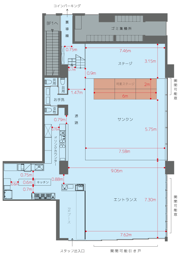 主たる特色を持たない多目的ホールは、ロケ撮影、イベント、飲食パーティーなど日々様々な用途で利用されるインタラクティブな空間です。